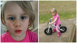 Esmai recently broke her nose while riding her bike. She went straight into a lamppost. The very next day she was back on her bike. Shes fearless! The lamppost was replaced a week later as she had dented it. She will be 4 next month!